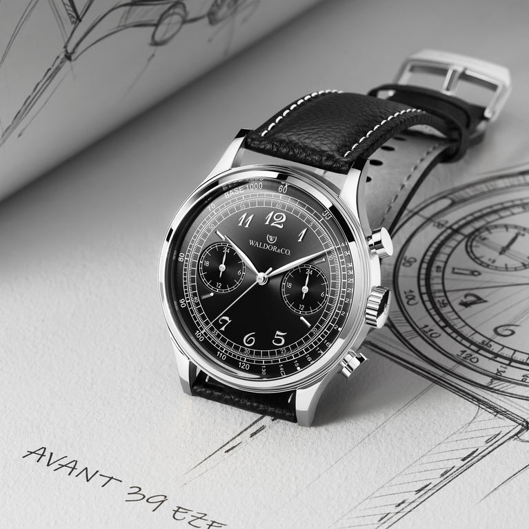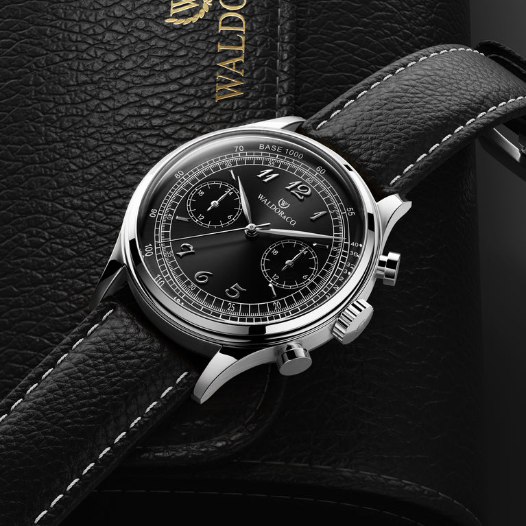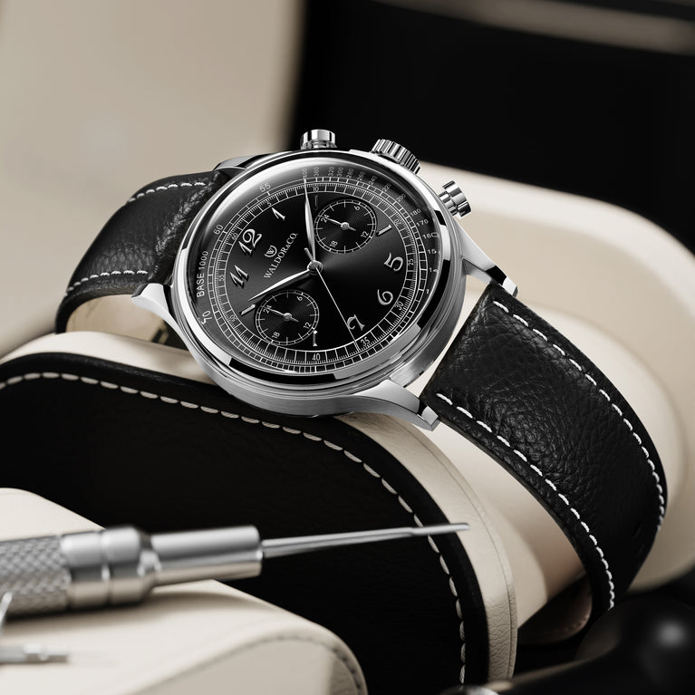 Strap: Genuine black leather, clasp in rhodium-plated 316L stainless steel