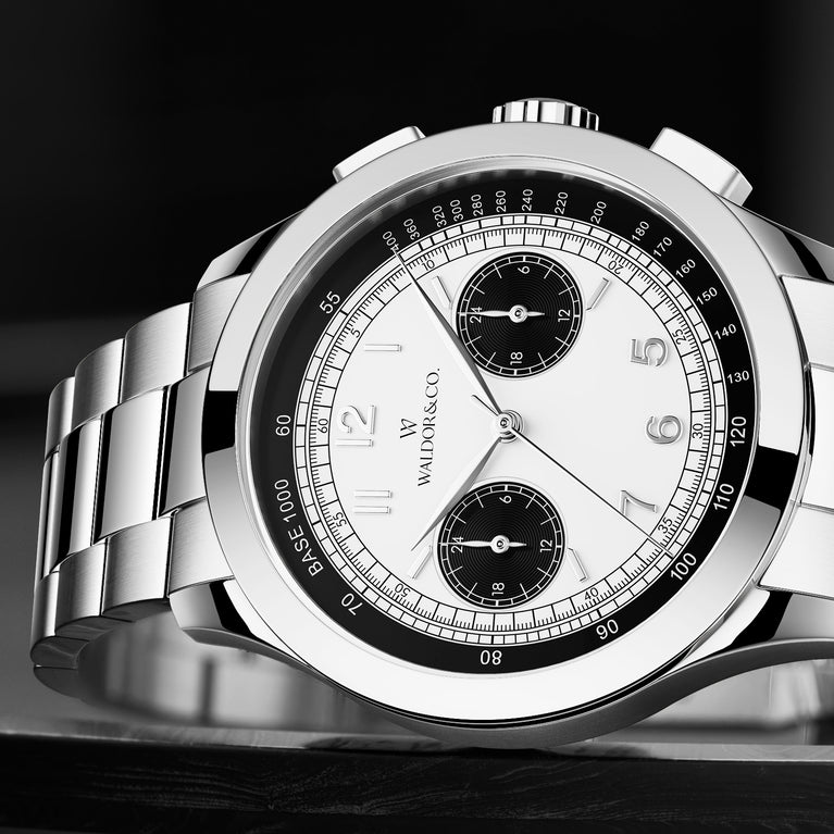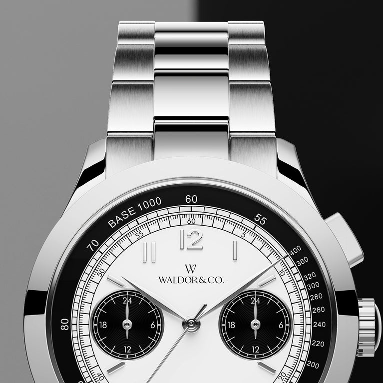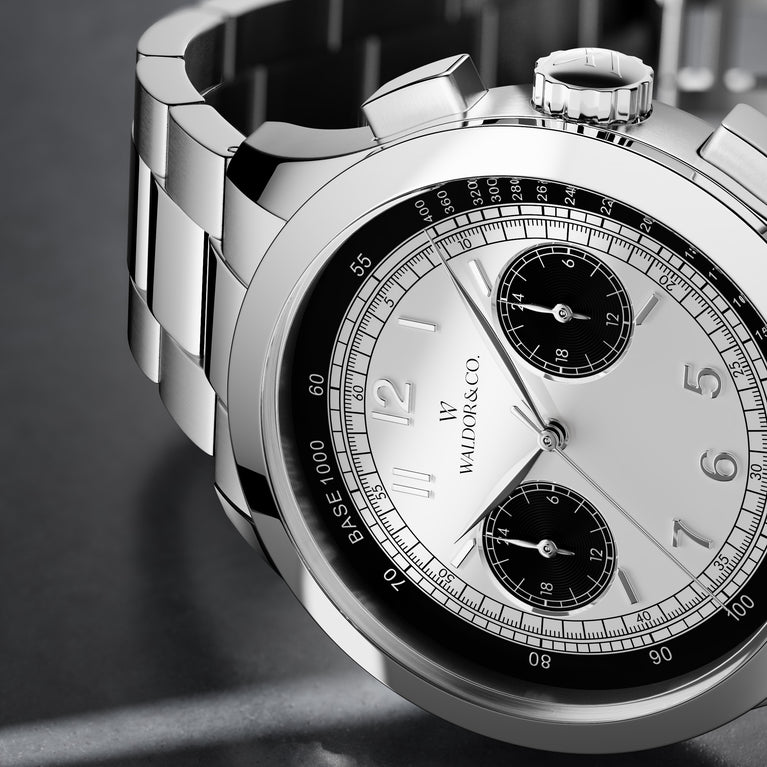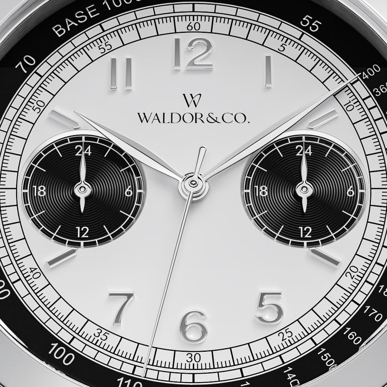 Dial: White dial in brass with contrasting black sub-dials and tachymeter scale