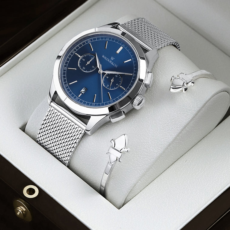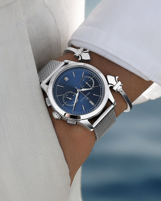 A considered pairing of the Chrono 44 Sardinia and the Icon Bangle, united by clean lines and confident presence. Together, they deliver a refined yet effortless expression. Now available as a set at a preferred price.