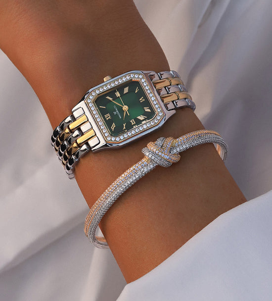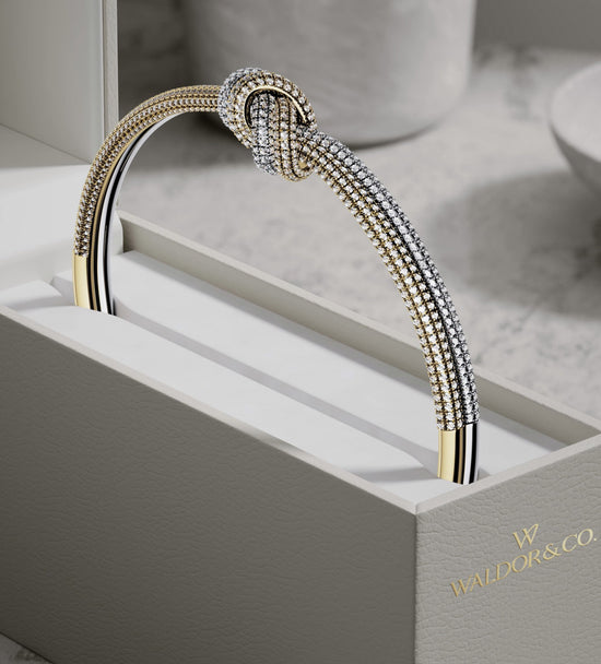 Match with the Dual Knot Bangle Pavè for effortless harmony in silver, gold, and pavé.