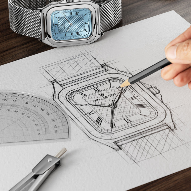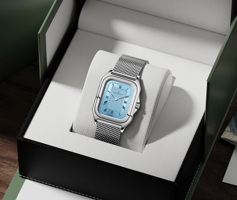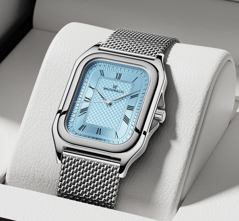 Dial: Blue patterned dial in brass with silver details